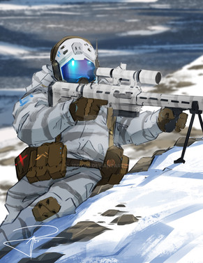 Arctic Sniper Teams are some of the most well-trained operators, receiving knowledge and instruction regarding extreme climate conditions, evasion, and tracking. These units tend to be utilized within mountainous areas, arctic regions, and environments that experience subzero temperatures. Their weapons and gear all function normally within these conditions because of heating and non-freeze mechanisms.(All artwork is digitally hand drawn and painted)