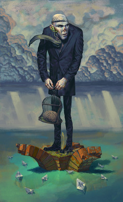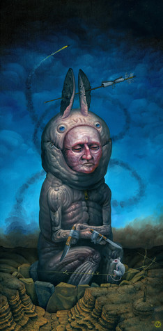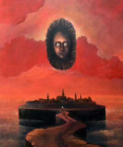 Thanks for the compliment. As for meaning, I got the idea while I was thinking about the ways superstitions and religions must evolve. I was trying to help my wife brainstorm ideas to write about. The painting turned out alot different than the original idea I had, but I think it did for the better. Originally I had a guy wearing a fake face on his head so that it looks at the sky, because of his uncertainty about the sky and the menacing things that are in it. Kind of like the moth with a pattern on it's wings that look like eyes so predators think the suprise elements out the window. Anyway, it's probably not anything near what you've gotten from it but that's why I don't include "meanings" with each one, everyone sees it differently and gets there own meaning. I hope I didn't ruin it for you.