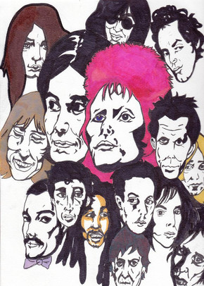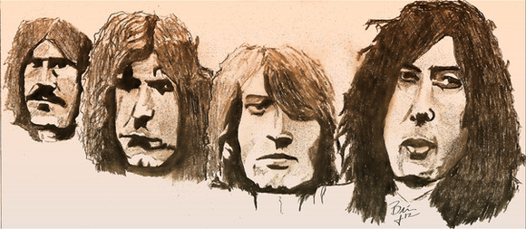 Deep Purple, MarkII, the pioneers of hard rock, in the monumental shape of their album cover "Deep Purple In Rock"Airbrush & water colours, 1999