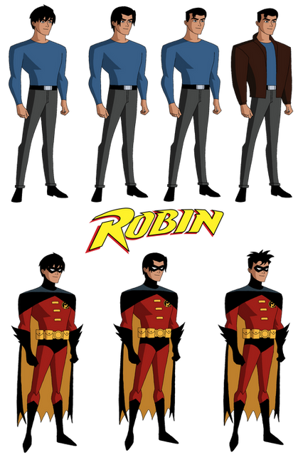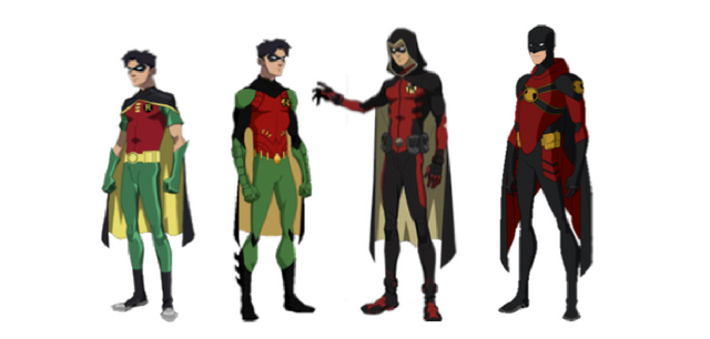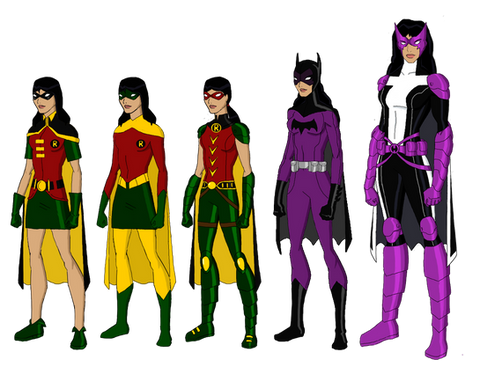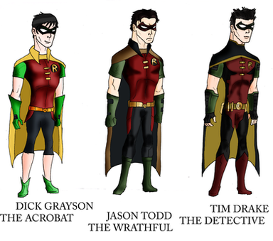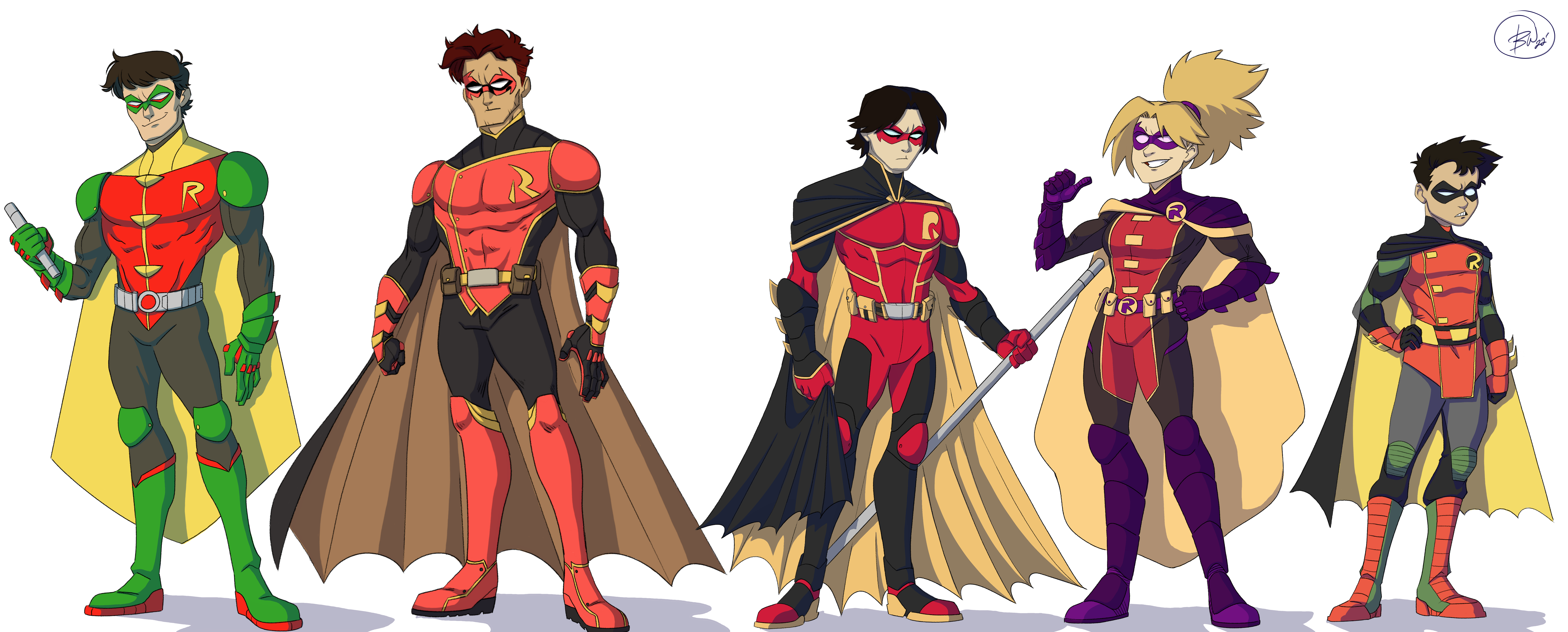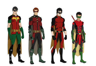 Dick Grayson, Tim Drake(Robin), Tim Drake(Red Robin), ??????(who' the girl?), Damian Wayne.