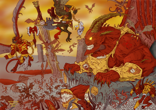 Provoked by the fervor of the Angel to break through to consummate the challenge, another great demon made an appearance with warp fire that declined the scales for the forces of evil, with great wings and a great Ax the devourer of souls "Ka'Bandha" with Canine face came to claim the life of the Angel and his impetuous children, The great demon "Ka'Bandha" mocked the Angel by revealing that his most appreciated brother "Horus" had orchestrated this slaughter of both the humans of "Signus Prime", the false cure of his legion and his inevitable death far from his father's murderer. (The empire of humanity would be destroyed by a demonic conspiracy.) 😨