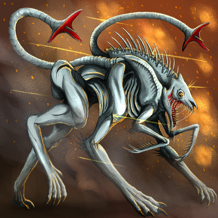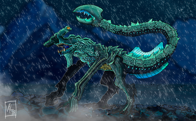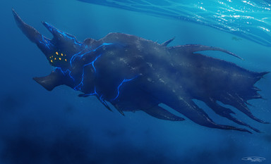 Big and bulky, "Knifehead" is a giant monster with marine similarities between a goblin shark due to its long and sharp nose fused with a sea turtle by presenting a shell on its back; Its four upper limbs are divided by difference in size and strength, with its upper arms presenting 3 debos and forearms with space of flesh but fused with the bone of the limb.The skin and tail are dark gray with a couple of lines bright yellows that run through part of its body, its eyes and mouth however emit a blue glow.
