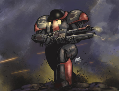 Each "Marauder" suit is supplied with energy and ammunition by a micro factory that they carry on their back for prolonged conflicts being an efficient soldier in the field; The first volunteers to use the "Marauder" suits died from the strong traumatisms of the constant explosions of the shots that left the suit intact but ended the life of the operator. Fortunately, the Terran engineer created a kinetic foam cover inside the suit that reduces the impacts allowing the survival of the human operator.