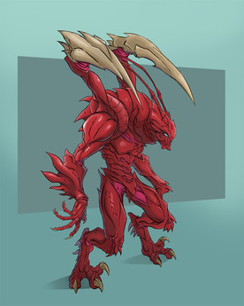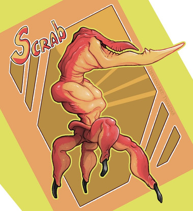 His red and yellow skin tone allows him to blend in with his natural surroundings as he wanders in the desolate valleys of βScrabaniaβ. The figure of the "Scrabs" in ancient times became a cult center for the warrior tribe of the "Mudanchee" who for years respected the "Scrabs" as sacred animals with their own tribal mark and hieroglyph. (When the Mudanchees died out the "Scrabs" became the guardians of their tombs and temples to compensate for their unwavering respect for them.)