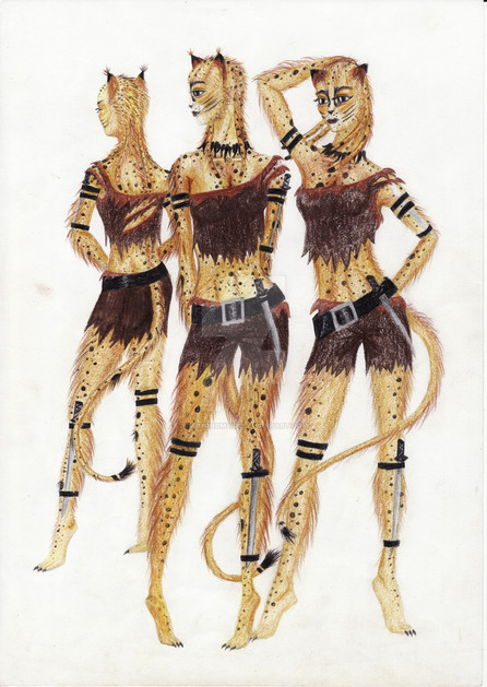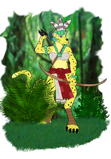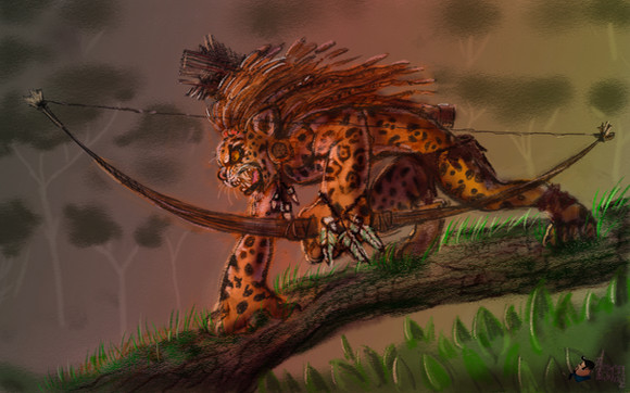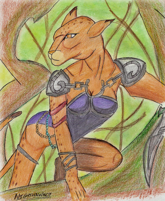Their character is very reserved and noble but their feline heritage drives them to be curious about magic relics or secret stories that motivate them to leave their homeland, their combat mode uses camouflage and surprise attacks with simple weapons or the worst case scenario with its own retractable claws and teeth.