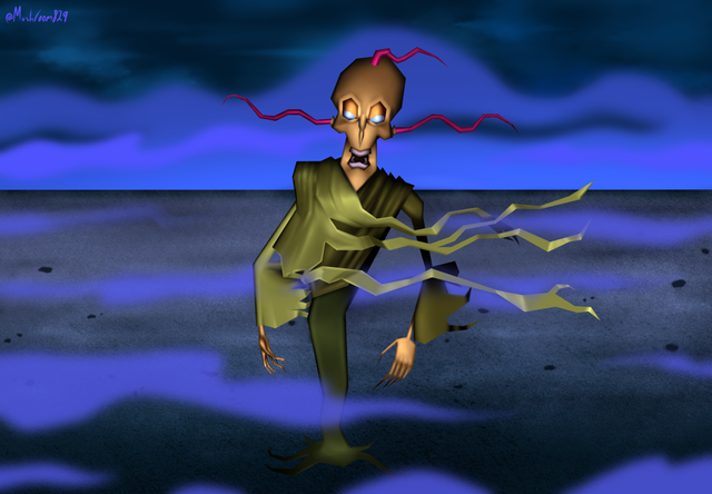 From another old Cartoon Network show, "Courage, the Cowardly Dog", we have the villain, King Ramses, also known as "The man in gauze, the man in gauze"This surreal guy only appeared in the episode "King Ramses' Curse" and is quite popular actually. Anyone who finds his slab will see him there, waiting to get his slab back, or else they'll suffer his curse. What's his offer? He has 3 different plagues to torture them, each one worse than the last. The first and third plagues he summons are flooding and a black swarm that will eat anything, respectively, but the second plague that's between them is, actually, hillarious. It's a loud and annoying song played on a phonograph.
