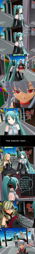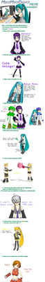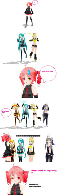 I was bored.... so I decided to use the most bizarre models I found in a short story. I think Miki, Rin, Haku and Miku do not liked their "new friends" mainly Miku XD.Sorry about mistakes, I did this pic running.