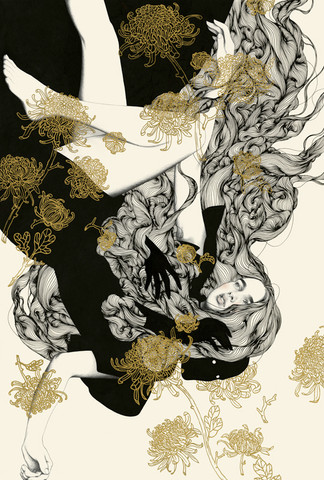 I like the composition and the using of black and white mixed with oranges colors. did you use chinese black ink?
