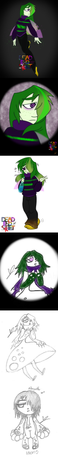 Gender: female Creature: sprite Hair: dark green Eyes: lavender Personality: preoccupiedLikes: Drinking alcohol, water, acting