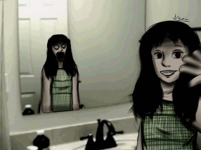 To make it worse, one of my biggest fears though is seeing something in a mirror (IN THE BATHROOM) and turning around to find nothing there. Or mirrors in general, they just freak me out. I can't stand to be in the dark with a mirror. It probably has some connection with all those Bloody Mary games you hear about.