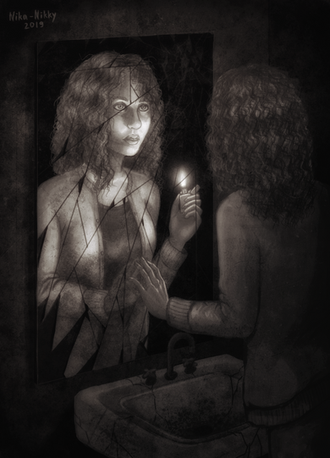 ....The scariest thing ever ; _ ; And omg, after reading description I just have to say, that I feel the same. I'm always afraid of going to the bathroom at night, but when I really have to do it, I avoid looking at the mirror and going back to my room as fast as it's possible xD (but there's probably smth other waiting under my bed, holy shit, I'm fucked = A = )