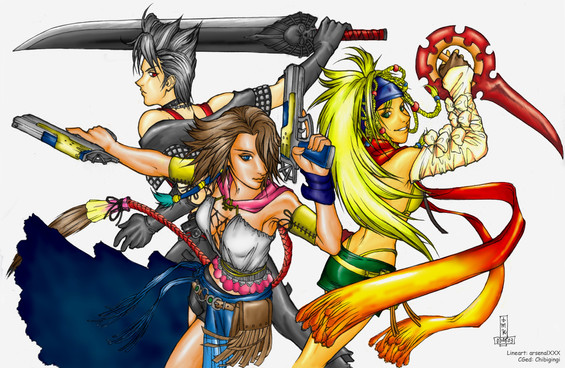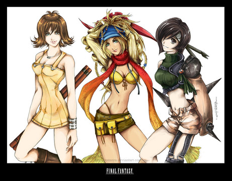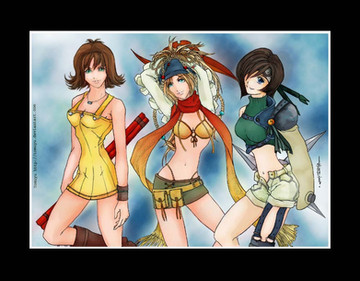 The fourth piece of a very large fanart project I'm working on, featuring Selphie (FF8), Yuffie (FF7), and Rikku (FFX). I did the lineart and final FX, and coloring credit goes to the following:Selphie - Pigeon (though his site seems to be not working! o_o)