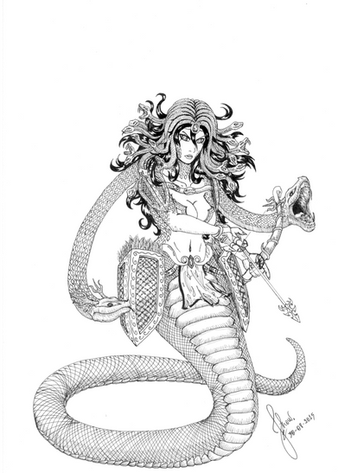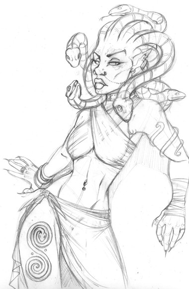 Mi unica sugerencia es que le borres la lenguita a la serpiente esta que está bien cerca del "jawline" de ella; ya que da la impresión de completar esa línea y se ve weird la cara.