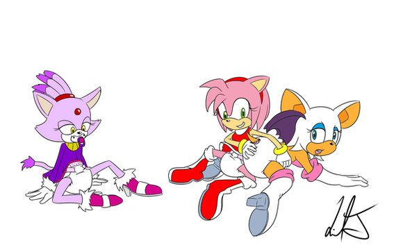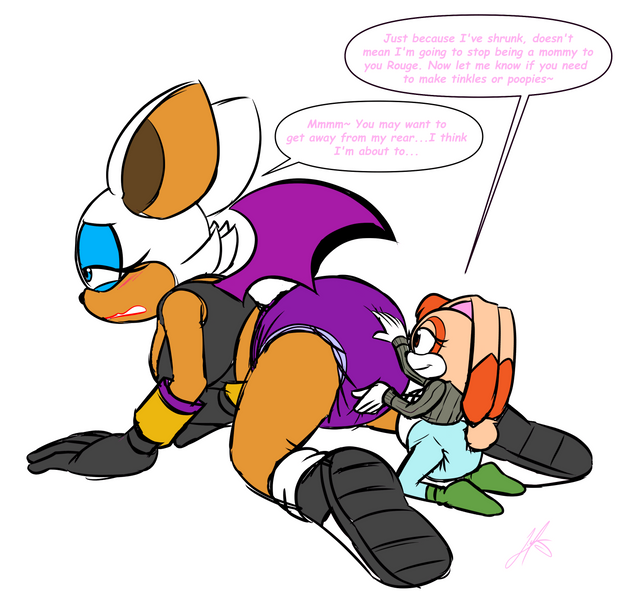 Here it is another commission from featuring rouge the bat and charmy bee. This pic may've been inspired from an old request with R55 [link]Anyway Rouge has just finished getting her diaper changed from charmy who voluntarity agreed to "adult babysit" rouge. As you can tell charmy hardly ever gets bragging rights since he's usually the little kid, but this time it looks like charmy gets to be the adult for once (maybe).
