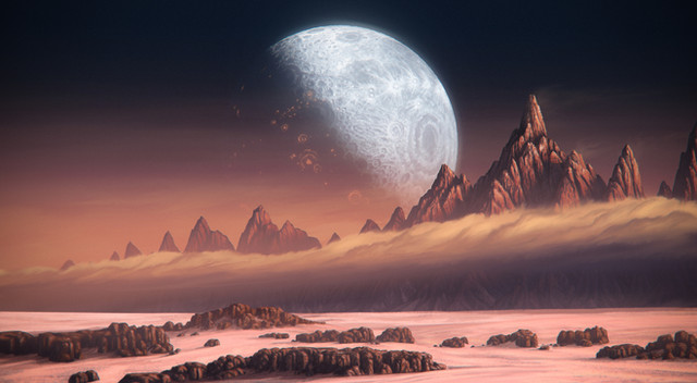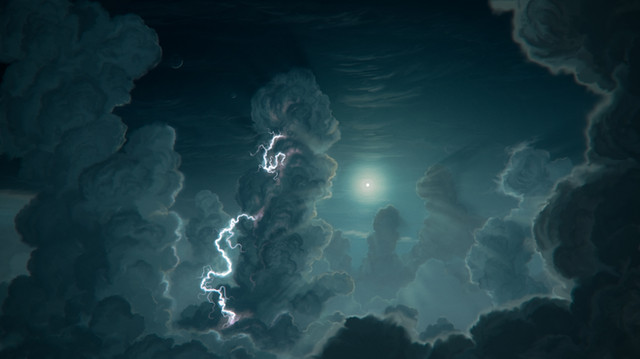 Nice work. I like your work on the lightning, and I also like the slight haziness of the atmosphere that obscures the moons a little bit: it gives a more natural sense of the view and allows the viewer to really feel it. Cool!