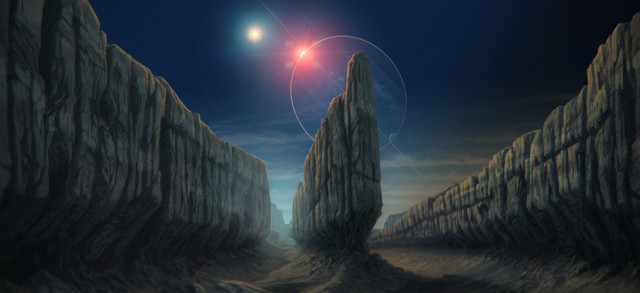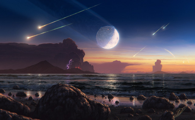 In the evening sky, just after the sunset, two crescents of volcanically active moons also hurry to hide behind horizon.