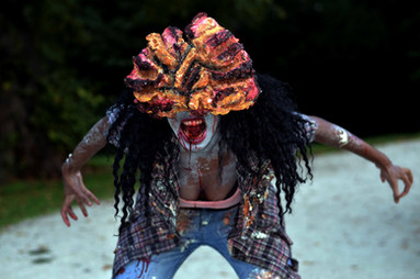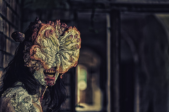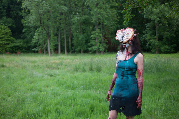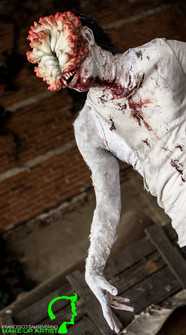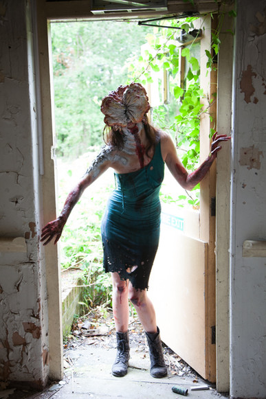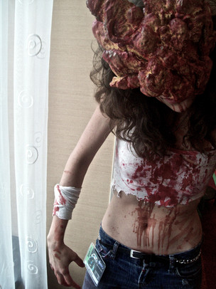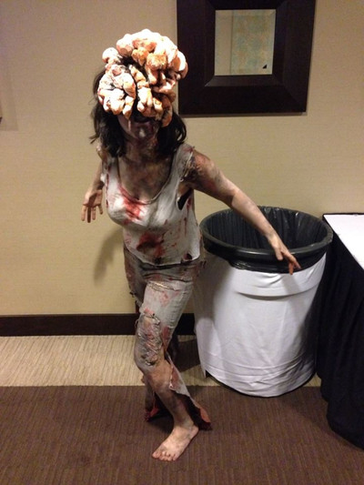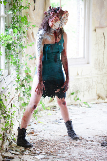 For a clicker she has some flawless pearly whites. I say that not only as a arbitrary compliment for the model but also as a helpful criticism too. I also feel the left side of her body, in specific the left shoulder as well as the legs, could've used more of that mutated aesthetic. The parts of the clicker that aren't forming some nasty protrusion are in the very least covered with aged lacerations, bruises, discolored skin, or tattered clothing. The facial piece is still amazing though, and the parts of the body that are actually covered are very interesting. In short, still a damn good clicker cosplay.