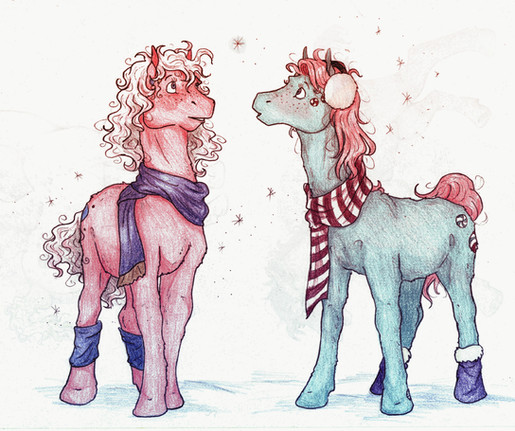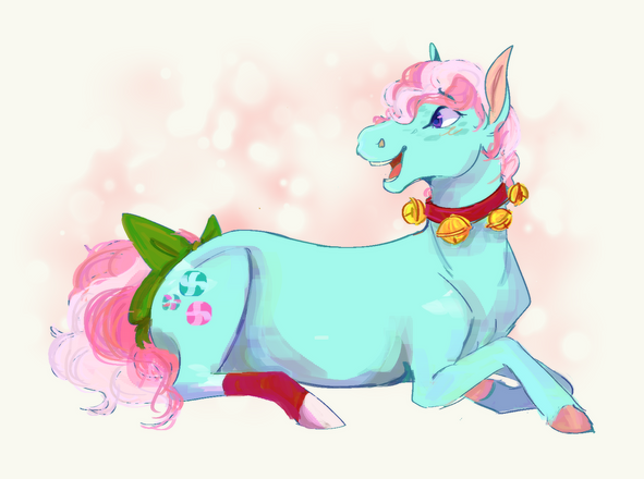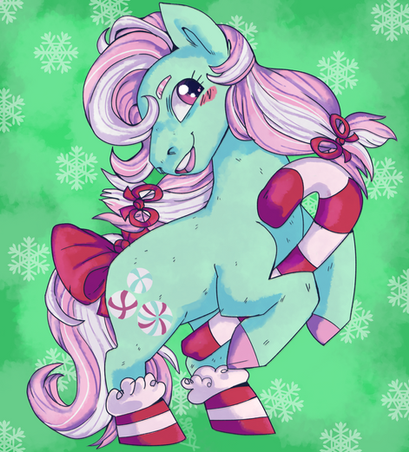 Character: Minty is an eponym of everything clutzy and awkward in a flesh: despite her good-hearted intentions she usually end up messing everything around, intefering others or overall being a stick on the road. Her innocent urges of meddling into other's affairs don't help either, but her ability of coming up with excuses and jokes sells on almost everyone - it's hard to hold grudges on this absent-minded pony for long as she usually forgets any misaunderstandings quickly herself. Minty acts like a clumsy, helpless, but playful young mare with a mind and imagination of a small foal, making her kind-natured and inoffensive, but extremely sensitive to others opinions and impressions. Minty can be too childish, annoying or naive from time to time, but she never intends any harm, having a gentle heart; although it's rare to ever see her truly mad, no one would ever want to mess up with her, her friends or offend things she likes, as she's pretty irrepressible. She's completely dedicated to her favourite things and does everything she sets her mind too with passion and fondness: she absolutely adores cooking, baking, skating, doing sports, and her main hobby includes collecting socks of all kinds. Minty has a huge collection and she is always ready to give some of samples as presents, being generous and selfless. Sweet-loving pony works in a family cafe called "Sweets and treats", being one of the best town's bakers beside Sweetberry, Triple Treat and Cotton Candy. In her freetime she likes trying out new things to do everyday, included but not limited to doing acrobatics, standing on her head, roller-skating and riding bicycle/scooter, and everything that increases her adrenaline, being extremely restless and active most of the time. Of all seasons she enjoys wintertime most, as it fills her days with more fun activites to do and things to try, - also being childlish-ly simple-minded, Minty believes that winter brings the most magical and hopeful time of the year - Christmas.