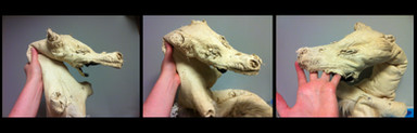 This was a bit of an experimentation on my end.A two part rubber mold was taken from the frozen body of young small sized rat. It was a tricky process to get it finished in time, and remove the rat afterward and getting all the hair out of the mold. I used wax to make the peices, because it was fast and had a bit of give to allow me to remove the cast without too much breaking. Detail wise, it was great. The eyes, the teeth, the toes, nails, fur, even whiskers showed in the end result. I was surprised, the whole thing was rather eerie but beautiful.
