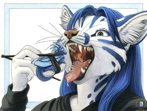 TaniDaReal having a good time taking JΓ€germeister shots at the bar, with Hida the little blue dragon clinging to her shot glass.. Looks like he crawled up to try a taste of the drink, but he might be in a bad position if she doesn't notice him when she takes the shot ^.^..Done with acrylic paints and airbrush on 9"x12" illustration board.