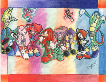 Weeee!!! X333 Me, Amy, and Cream gave Knuckles a new haaaaiir duuuuuue!!! I always wondered what he would look like if you could pull back his dreads like a pony tail! The original doodle looked better cuz the pony tail was lower but this works too!