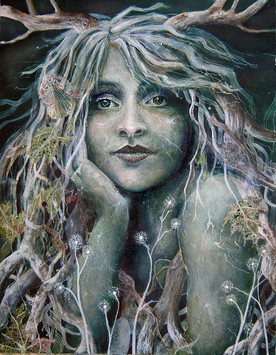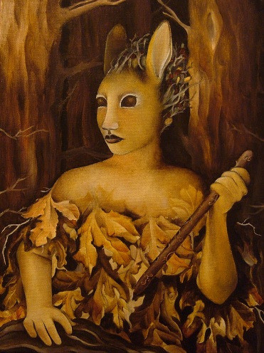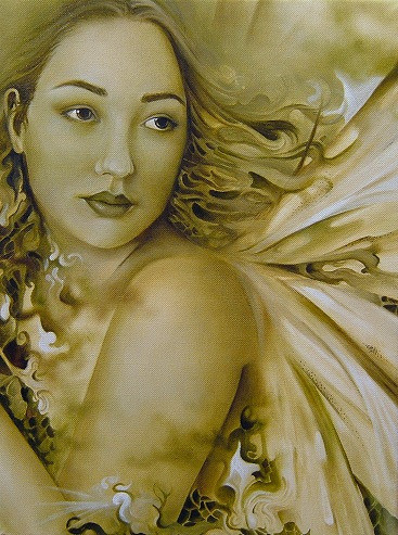 I'm not so happy with the anatomy here. Obviously it was never intended to be perfectly human, but I'm not sure that I really got the moth/human anatomy mix thing working. Oh, and please ignore the hands for now. I know they look ridiculous but they aren't finished, and I can't work on them anymore until the paint is dry. I didn't want to wait for the hands to be finished to upload the painting, though. Anyway...When I first started out with this one, I had intended for it to be along the same lines as Cabbage Faery. It was going to just be the figure in shades of brown and white, emerging from a mist. But, I decided I wanted to mix a big splodge of red to the mist, on the right. Then I thought to add some vague leaf shapes to that red area. That turned into more leaves, then the face appeared, more leaves came...