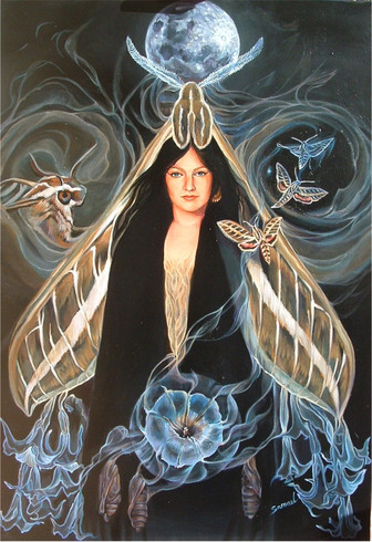 I love how you've incorporated the moth wings into her clothing and how she is so pale and powdery against the richer dark tones of the background. Beautifully done.