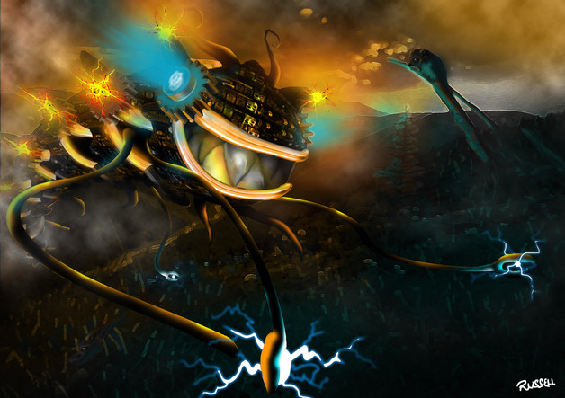 This is for a friend of mine, it's the Arcbound Ravager (from MtG), chasing a few Myr. This is the grand finale of my "Metal Period", I thinkThis took so long o_O, btw. But it paid off, I guess.