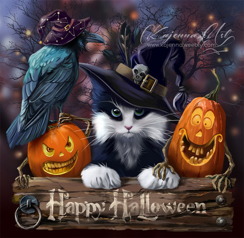 #black #dark #digital #drawing #halloween #kitty #magic #night #painting #pumpkin #wizard #kajenna