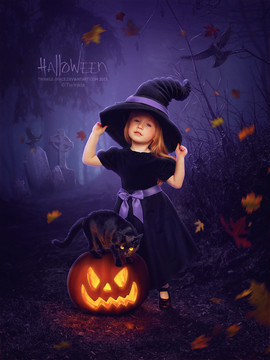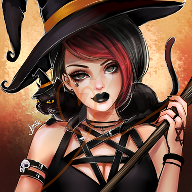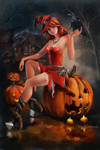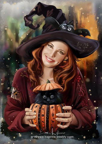 #autumn #black #cat #digital #drawing #girl #halloween #hat #holiday #illustration #mystery #october #pumpkin #red #watercolor #witch #kajenna