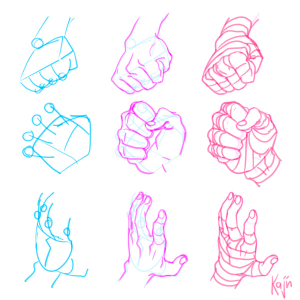 As I do not upload much content here decide to upload some sketches and mini tutorials.I woke up like drawing hands, so this is how I visualize in my head the structure of hand, this is not an exact representation, just a simple idea that helps me to remember the structure of the hand, the circles do not represent the articulations, it is just a reminder that the fingers have a thicker area near the middle. I know that the wrist bone is not prominent from this angle but for some reason I feel that it is always better to make it visible.