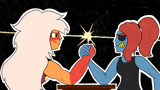 Cut to a wide shot, neither Jasper or Undyne has moved or broken their knuckle lock or even stopped screaming at each other for five minutes.