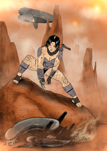 Little Fighter knew this young girl was in dire trouble when she was completely caught offguard by the drone leaping headlong at her. Little Fighter didn't have time to question this hybrid girl's reasons for being here. She knew her enemy, and it was the black death! Little Fighter closed the distance between them impossibly fast and threw her spear at close range, into the drone's skull. The drone screeched and fell behind its intended prey, flailing on the ground before dying. Tia'ja reached down and retracted the telescoping spear before turning to face Little Fighter. The sounds of hissing filled their ears from every direction. It seemed the hard meat Queen knew they were coming and lured them into an ambush. The Queen thought she had made the hunters the hunted. She was sorely mistaken.