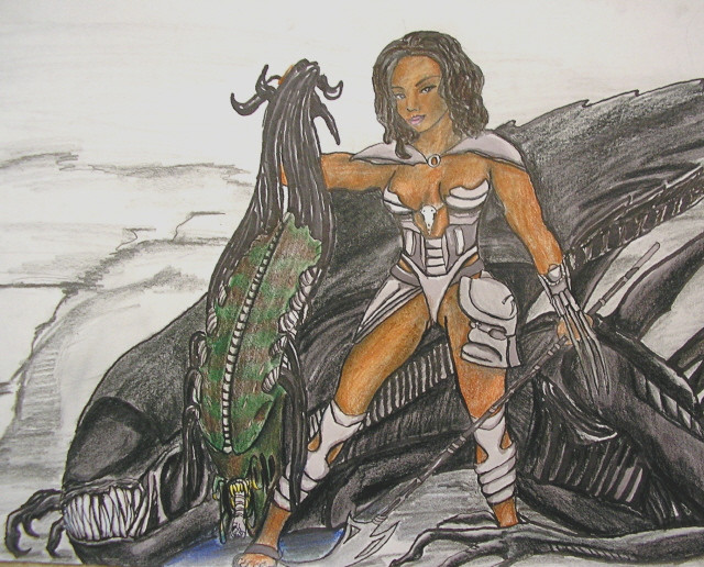 Tia'ja was excited. No, she was more than excited; she was living her life on a knife's edge and it thrilled her to the core! Her heart was beating faster with each passing moment, her breath escaping her lips in quick gasps. The hunting party from her clan had landed only a few hours ago on this humid jungle planet for a Hunt. The Yautja Half-Breed named amoung her tribe as Tia'ja, ran as fast as she could, seemingly with abandon, towards the hive she knew was just a short distance ahead. Tia'ja had but one agenda this day; a kill worthy enough for a trophy to prove she was a true member of her clan and not merely an outcast.Little Fighter felt the calm she usually felt before a fight. Her breathing was slow and rhythmic; her steps quiet and measured. The Ooman woman known amoung her clan as Little Fighter was well aware of her preys' location and she moved towards their hive with surgical precision. Garv, her Yautja husband, was moving around to flank the hive as were a handful of other males. Little Fighter tried not to think too much of her lover, for she knew he would face down any threat before him. Today she thought only of herself. Battle stances and fighting katas rehearsed almost subconsciously in the back corners of her mind. Little Fighter only had one concern; emerging from the hive with a trophy that would prove again her worth to the clan; prove that she wasn't just an Ooman and that her heart was Yautja. To prove once and for all that she was no outcast.