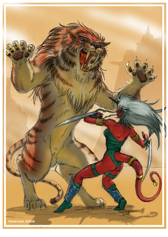Tia’ja did not understand the sing-song melodic language, but it wasn’t hard to see her intent. Some old sentiment for Oomans made Tia’ja hesitate and she nearly lost her head for it, as the sword cut through the air at a blinding speed. Extending her claws, Tia’ja stood at the ready. She would have to get in very close to get passed that sword, and she knew this warrior would not make it easy. Perhaps this would be more fun than she thought…