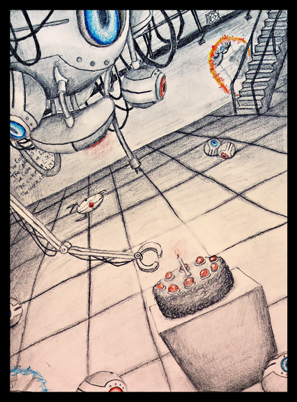 I drew it in class, started yesterday and finished it today.Aperture Science, GLaDOS, and the Weighted Companion Cube are from Valve.