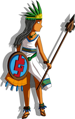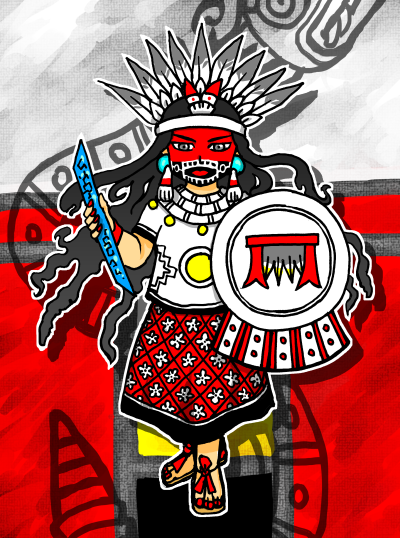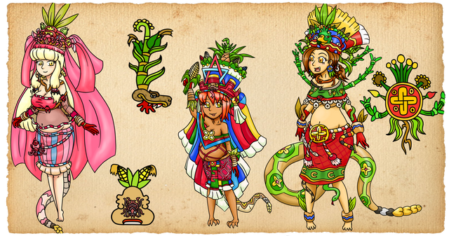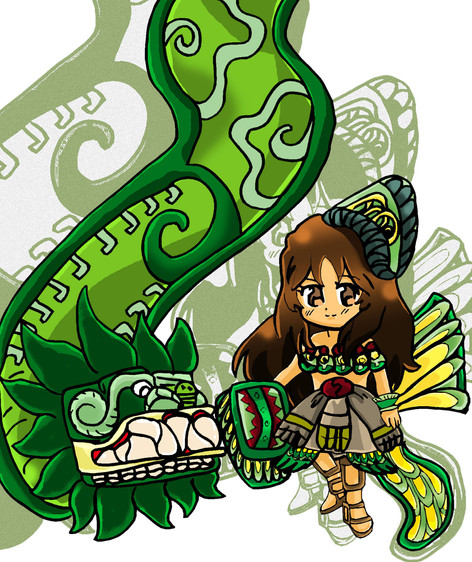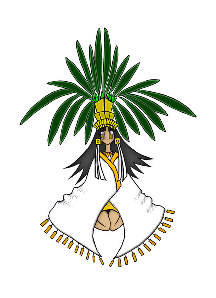 A chibi version of a Zapotec Princess. She is from the royal capital of Zaachila, a small island city (mostly a royal residence) in a lake located in the valley of Oaxaca. She carries a fan in one hand and the royal standard of the same city in the other. Her style of dress is based on a Zapotec queen depicted in the Mixtec codex Zouche-Nuttall.Female rulers among the Mixtecs and Zapotecs generally wore the same clothing, except for the textile patterns and colors which designated their city of origin and their headdress. Mixtec queens and princesses wore twisted colorful turbans, while Zapotec Queens and Kings both wore the draped mantle over their crown. Mixtec and Zapotec women both wore the basic female outfit consistent throughout all of Mesoamerica and among all classes - the skirt. Women in Oaxaca were rarely topless, especially royal members, which wore a short cape that hung behind. Over the cape they wore the quechquemitl. For examples of quechquemitl's see [link]