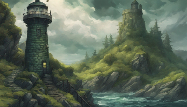#arch #arched #bridge #clouds #cool #cyan #fog #green #grey #island #lamps #light #mages #magic #mist #mystic #overcast #peaceful #sea #sky #tall #tower #trees #waves #wind #wispy #wizard