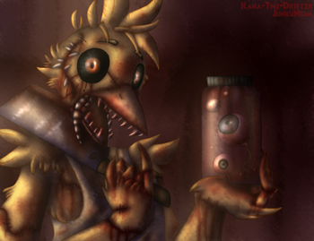 Springtrap by Kana the Drifter, is a uniquely dark but soft take on the main antagonist Springtrap. The shading makes the drawing easy on the eyes and has a sense of depth from the subject and the background itself. Springtraps details are amazingly well done right down to every last wire and bone, the additional blood on the teeth is also a nice touch too.