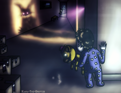 Absolute outstanding. The lighting and coloring in this piece are perfect; it almost looks and feels like it's part of the game itself rather than a piece of superb fanart. The lights at the guard's office mirror what it must be like inside Fazbear's Fright: a dirty, scab-infested place that reeks of evil and bad consciences (I mean, you have to be pretty damn callous if you try to capitalize on real-life unsolved murders of missing children, urban legends or not). As David Near's Phantom Freddy says: "This place is nothing but a mockery to all those who lost their lives at Freddy Fazbear's Pizzeria. Every person who comes here is no better than the monster who took those innocent lives."
