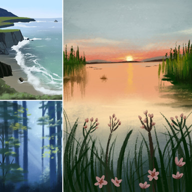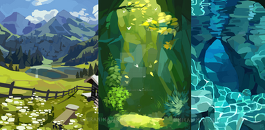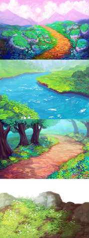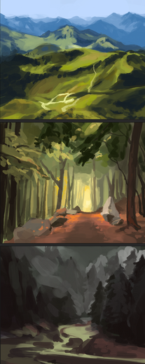 I really want to do more scenic backgrounds in my work, so doing some studies like these will help meee. Even though I've done some before, I don't think they're very cohesive with the characters;