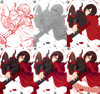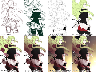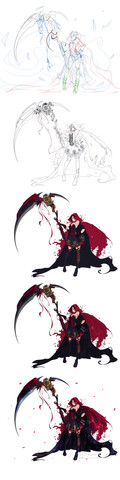 Was looking through my stash, and I realized that most of the tutorials/processes/"lessons" I do are mainly for people on my stream now, and I feel bad because dA has really helped me with growth and its where most people follow my work, so I thought I'd upload this process. I uploaded this on my twitter and put a stash link so that people could see the full view.In all honesty, I don't actually follow this process. For me, I get bored really easily if I work on one thing too long, so I usually work back and forth on her, the objects, and the bg, rather than finishing her entirely and then working on say, the scythe.