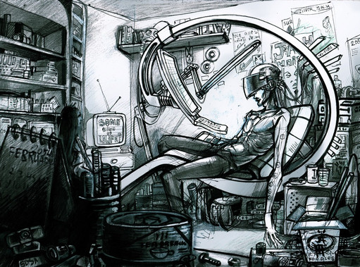 I love the detail in this; the deep concentration on the figure's face, and all the segements of the metal arm Best part is gotta be the cigarette hanging from his mouth, and the "Beer" and "Coffee" pipes xD Just those little things that suggest he may be mainly a machine, but there is still a bit of human in there.