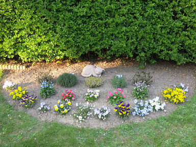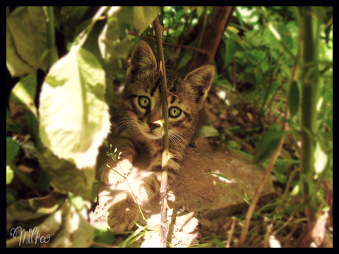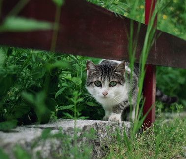 The young visiting cat from two doors down tries to hide herself in the bushes at the end of the garden... :3