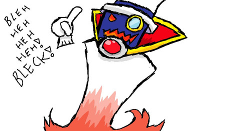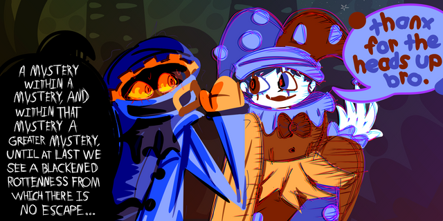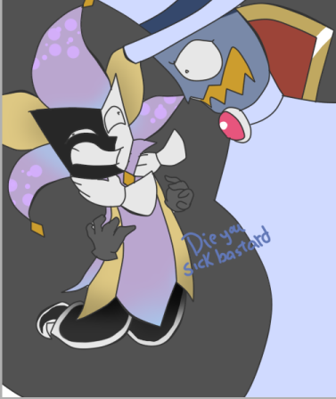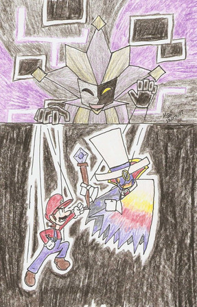 Ahahaha... Yes, the reference to dear little Nastasia as a "silly assistant" is quite untrue, actually. That was from a quote(as seen at the top of the artist's comments, before the spoiler warning) where Dimentio was calling her silly because she took a blow for Count Bleck when he had already admitted defeat.