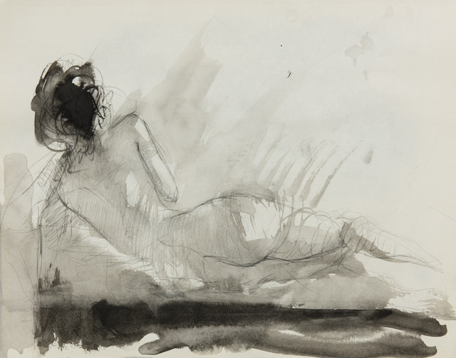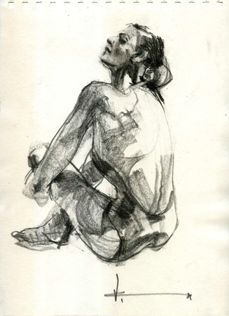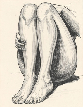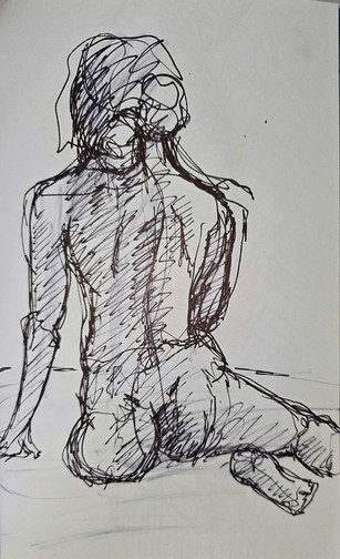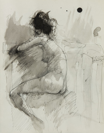 Nude male posing for a drawing. Resting his hand on his knee, drawing done with water ink black and graphite pencil on a light yellow paper.