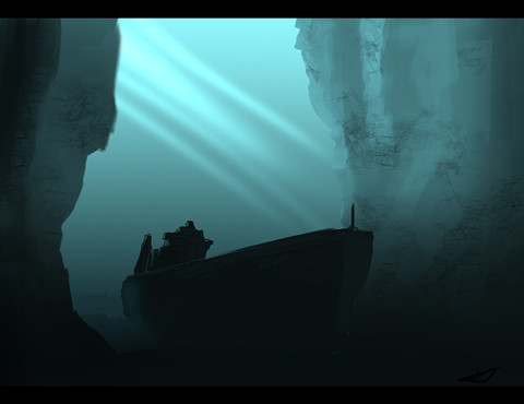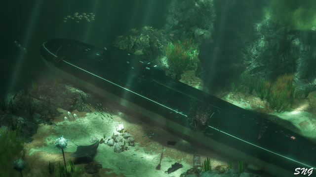 It was a model of submarine on which I have set special light and rust textures. In this kind of environment you will not notice that's not real submarine. Rocks and walls has been taken in Masca Gorge - Tenerife.