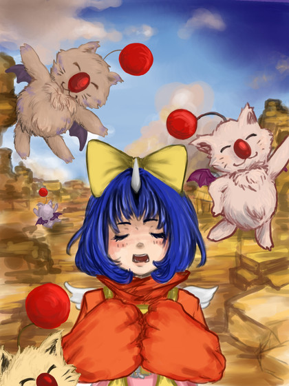 "[A] picture of Eiko looking away and pouting as she blushes and crosses her arms from her parachute snagged on the trees; Zidane is snickering at this sight while Garnet (or Dagger, whichever you like to call her) is giggling, trying her best not to burst into laughter. These three are from Final Fantasy IX."