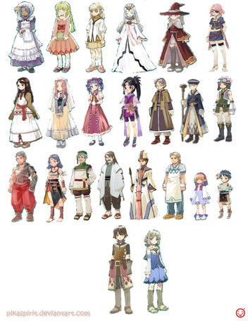 Harmonia: (08/16/10) Wow.. I knew Harmonia would be associated with sunflowers and stuff, but I hadn't expected this combination. Regardless, I like her color scheme and design (although, it's a bit complex). Somehow, she became one of the taller characters in the series. AND I drew her (unreferenced lol) bow that is currently taking up a lot of white space. Sorry ;;.