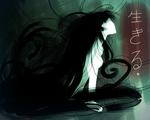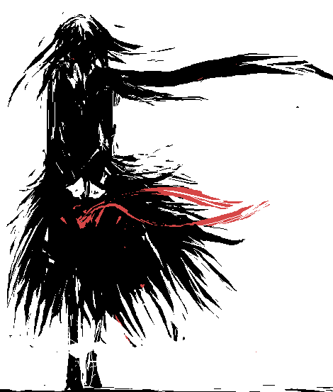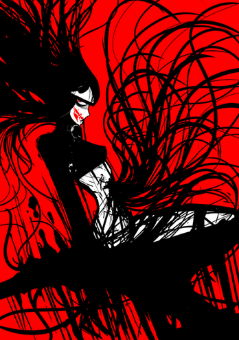 What I love about THIS image, is that there is a great sense of motion and wind blowing the hair back, and blowing the little red petals/leaves/blood splatter to the right of the picture. Additionally the shadow on the ground creates the sensation of a strong and low altitude light source which adds an aggressive sensation to the image, even though the figure is just kind of standing still. The perspective creates a depth to the scene, enhanced by the shadows and is brilliant in its simplicity.